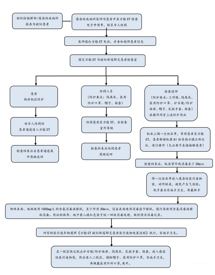 除X线电离防护外,方舱CT检查需对操作技师、患者及家属做相应的防护。根据国家卫生健康委办公厅印发的《新型冠状病毒肺炎防控方案》(第五版)[6]对于在新型冠状病毒感染的肺炎疫情防控工作中不同的工作人员其防护等级是不同的。如是疑似患者,技师则执行二级防护。方舱CT内,设置清洁区、一脱区、二脱区、免洗手消毒液、一次性防护服、一次性乳胶手套、鞋套、洗手液。技师需经多次反复训练穿脱流程和检查流程,并做好总结,考察合格方可上岗。为此我科花费了大量时间进行了防护用品穿脱,消杀,接诊流程的演练,并做总结和改进措施。(附件1所示),防护用品穿脱流程如图2所示。