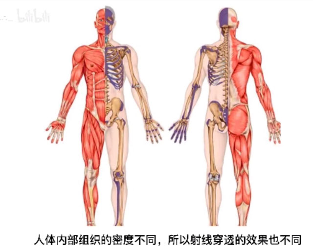 有时候有点咳嗽,需要使用DR拍片检查。病人需要躺到DR检查床上面,影像所见:两肺中下野内中带(坠积部位)可见肺纹影增多、增粗、模糊。病变部位小叶实变并存多发散在斑片状高密度影,密度不均。影像诊断:考虑间质性肺炎?请结合临床。接下来我们来简单的理解DR的拍摄原理。X射线的特殊属性是穿透性。DR就是利用了这个特殊属性。人体内部组织的密度不同,所以射线穿透的效果也不同。比如肺被穿透后,因为它没有阻挡,在X线片上就是黑的,胶片能够全部曝光,所以呈现出来是黑的。骨骼肋骨不容易穿透,所以它显示出来就是白的。