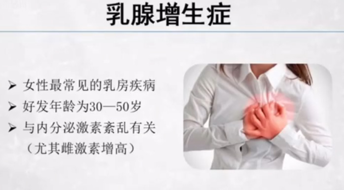 乳腺增生症,女性最常见的乳房疾病,好发年龄为30-50岁,与内分泌激素紊乱有关,(尤其雌激素增高)。身体有不适,乳腺胀痛,月经前几天疼痛加剧。月经来完减轻。有多个结节,圆形或者条索状。乳腺上皮和纤维组织增生,乳腺组织导管和乳小叶在结构上的退行性病变,进行性结缔组织的生长。乳腺超声设备检查的超声表现为:乳腺囊肿:乳腺腺体内有无回声区,它的边界清,后方回声增强。乳腺腺体多个结节,圆形或椭圆形,边界清,体积一般较小,无明显包膜,一般无血流信号显示。这种情况需要特别小心,乳腺瘤样增生需与乳腺纤维腺瘤、乳腺癌相鉴别??山岷掀渌璞讣觳槿?钼靶检查、超声、核磁检查。结合其他影像学设备辅助检查。鉴别困难可以在超声引导下穿刺活检。那么它的临床价值在哪里呢?对于有典型症状者,尤其是临床触诊发现的局部异常,如结节、界限不清的片状增厚区超声可以进行有针对性的检查有助于判断临床触诊异常区域的原因及合并疾病。发现有异常就需要超声检查。