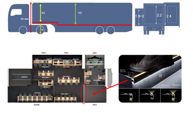 由于国家限定了转播车在行驶中的尺寸,尤其是高度和宽度,无论选用什么车型,宽度都限定在2.55米以内,因此只有通过增加拉箱来扩展使用空间。