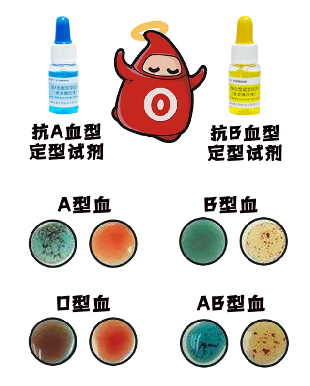 在献血时候,医护人员对献血的人的血型进行检测??梢酝ü笰抗B血型定型试剂完成。蓝色就是抗A血型定型试剂,黄色就是抗B血型定型试剂。通过试剂检测:和蓝色试剂发生凝集的就是A型;和黄色试剂发生凝集的就是B型;两个都发生凝集就是AB型;两个都不发生凝集就是O型。乙肝筛查检测也是一样使用试剂条来进行,显示两杠就是阳性,一杠就是阴性。因此无论我们是什么血型的都可以参加献血,每种血液都是有人需要用到的。都会有跟我们血型匹配的人等待血液救助。拯救与你血型相同的人。
