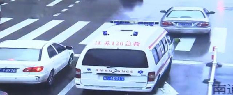 电影情节在道路上出现了,一路绿灯让救护车通行