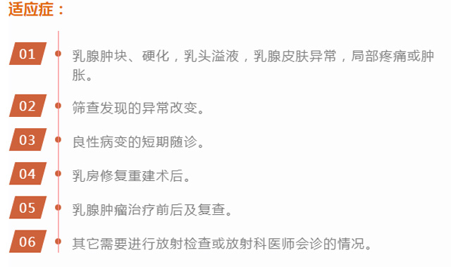 乳腺DR穿透乳腺软组织,达到对乳腺内组织进行诊断的目的。无痛准确度高,可以检查到医生触摸不到的位置??梢员辉缙诜⑾趾驼锒?。乳腺DR是乳腺检查的重要方式之一。图像清晰对比度高??梢圆榈叫∮?厘米的结节。辐射量小,对人体损害小。适应症:乳腺肿块、硬化,乳头溢液,乳腺皮肤异常,局部疼痛或肿胀。筛查发现的异常改变。良性病变的短期随诊。乳房修复重建术后。乳腺肿瘤治疗前后及复查。其它需要进行放射检查或放射科医师会诊的情况。对于30岁以下、无明确乳腺癌高危因素或临床查体未见异常的妇女,不建议进行乳腺DR检查。禁忌症:妊娠期患者、乳腺近期手术后切口未愈合着;急性乳腺炎患者等。