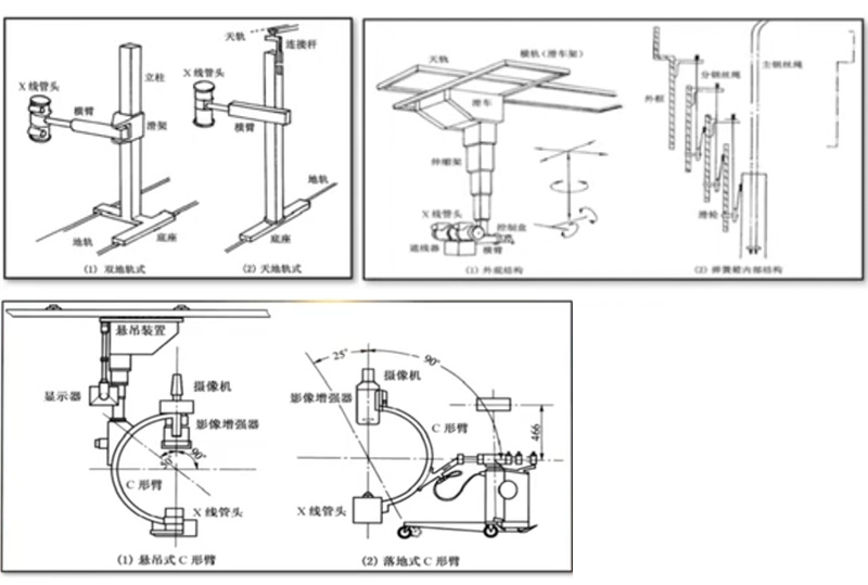 落地式:分为双地轨式X线管组件支持装置、天地轨式X线管组件支持装置和摄影床一体化式X线管组件支持装置。双地轨式X线管组件支持装置:立柱由两条地轨支持,立柱固定在底座上,底座在双地轨上滑动,带动立柱和X线管组件在双轨道上纵向水平移动。这种立柱支持方式对机房高度无特殊要求,安装方便,缺点是地面轨道较多,显得不整洁。天地轨式X线管组件支持装置:立柱由一条地轨和一条天轨支持,其主体由立柱和连接杆组成。连接杆可上下伸缩,以在一定范围内适应不同高度的房间。天轨不承重,只起支持作用,安装不太复杂,应用较多。这种结构形式地面上只有一条轨道,较为整洁。悬吊式X线管组件支持装置与前面落地式X线管组件支持装置相比,结构复杂、安装难度较大、相对成本较高,但它能充分利用机房上部,具有运动灵活、操作方便、运用范围广的特点,所以特别适用于多功能X线摄影。悬吊式X线管组件支持装置由固定纵向天轨、移动横轨、滑车、伸缩架、横臂、控制盒和X线管组件等组成。为适应各种不同X线特殊检查而设计的,名称因其形状而来。C形臂的一端装X线管头和遮线器,另一端装摄影转换和记录装置如影像增强器、电视摄像机、点片照相机和电影摄像机等。C形臂式可以和悬吊臂式的装置结合,组成悬吊式C形臂支持装置可以与专用底座结合成落地式C形臂支持装置。