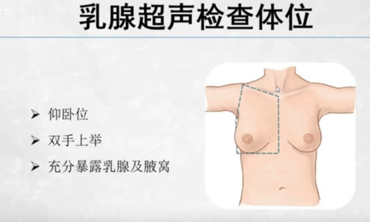 乳腺检查患者准备,检查前患者无特殊准备,“即来即做”,对月经周期并无太大要求,很多人有焦虑来月经咨询能不能做检查。这个完全没有影响的。乳腺DR超声检查月经期不会对整个乳腺的检查有影响。那么检查的时候一定要让患者脱掉上衣,采取仰卧位,双手往上举,充分暴露乳腺及腋窝这个区域,那么检查的时候采用仰卧位。检查外侧象限的时候,常常需要调节体位,身后可以垫一个枕头。检查较大乳腺下部时,可用手向上托起腺体。特别是大乳腺的我们就要不断的调整患者的体位。有时候还需要一个助手来帮助托着乳腺来检查。所有的目的就是为了防止漏诊。