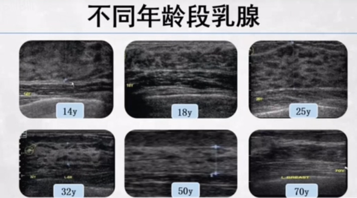 不同年龄段乳腺的超声表现,随着年龄增长而异。取决于内部的脂肪纤维和腺体组织的多少。