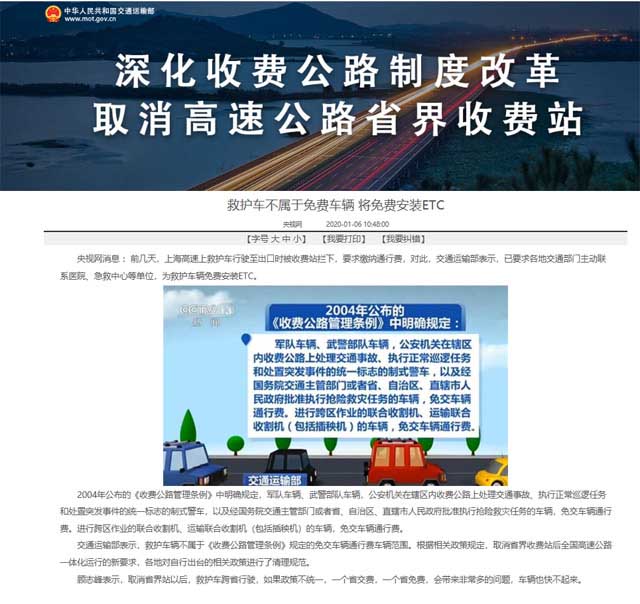 报道称: 央视网消息 :前几天,上海高速上救护车行驶至出口时被收费站拦下,要求缴纳通行费,对此,交通运输部表示,已要求各地交通部门主动联系医院、急救中心等单位,为救护车辆免费安装ETC。 2004年公布的《收费公路管理条例》中明确规定,军队车辆、武警部队车辆,公安机关在辖区内收费公路上处理交通事故、执行正常巡逻任务和处置突发事件的统一标志的制式警车,以及经国务院交通主管部门或者省、自治区、直辖市人民政府批准执行抢险救灾任务的车辆,免交车辆通行费。进行跨区作业的联合收割机、运输联合收割机(包括插秧机)的车辆,免交车辆通行费。 交通运输部表示,救护车辆不属于《收费公路管理条例》规定的免交车辆通行费车辆范围。根据相关政策规定,取消省界收费站后全国高速公路一体化运行的新要求,各地对自行出台的相关政策进行了清理规范。 顾志峰表示,取消省界站以后,救护车跨省行驶,如果政策不统一,一个省交费,一个省免费,会带来非常多的问题,车辆也快不起来。