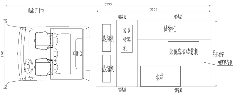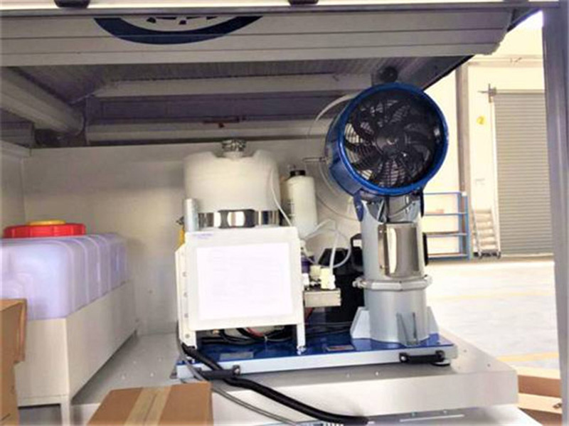 防疫车采用一个驾驶室与车厢进行分离的厢式结构:分为驾驶室工作人员乘坐之用;另一部分为可开式车厢,安装有多用途喷雾机和其他附件设备。防疫车具有经济的大功率超低容量喷雾机,特配的高速喷头。34平方米/每分钟速率喷射??梢源锏?0%低于20微米的雾化颗粒。射程有30米左右。续航能力强。充电一次可以工作4个小时。70分贝以内的低噪音。